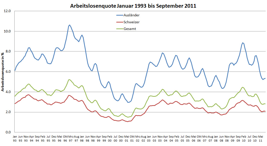 In den 1990er Jahren verharrte die Arbeitslosenquote  während über 5 Jahren auf einem hohen Niveau von über 4%. Die Arbeitslosenquote der Ausländer stieg sogar auf über 10%. Ganz anders während der Finanzkrise vor wenigen Jahren. Trotz massivem Negativwachstum (siehe erste Grafik) ist die Arbeitslosenquote nur für kurze Zeit über die 4%-Marke geklettert und nach kurzer Zeit wieder gesunken. Auch die Arbeitslosenquote der Ausländer lag nur für kurze Zeit über 8% und sank dann rasch wieder auf ein tiefes Niveau. Diese Zahlen zeigen klar, dass die Einwanderung als Folge der Personenfreizügigkeit zu keinem Anstieg der Arbeitslosenquote geführt hat und dass es insbesondere keine Einwanderung in die Arbeitslosenversicherung gegeben hat.