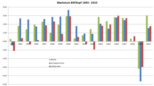 Nach dem verheerenden EWR-Nein 1992 und dem darausfolgendenden fehlenden Zugang zum EU-Binnenmarkt wies die Schweizer Wirtschaft klar niedrigere Wachstumsraten auf als die EU und die Weltwirtschaft. Erst seit dem Inkrafttretend er Bilateralen (inkl. Personenfreizügigkeit) ist die Schweiz wieder einigermassen konkurrenzfähig. Das BIP/Kopf ist nur im Jahr 2009 gesunken, als Folge der globalen Finanzkrise. Ansonsten ist das BIP/Kopf seit der Einführung der Bilateralen wesentlich stärker angestiegen als in den 10 verlorenen Jahren nach dem EWR-Nein. Die äusserst produktiven Einwanderer, die im Rahmen des Personenfreizügigkeits abkommens zu uns kommen, haben dazu beigetragen, dass das BIP/Kopf gestiegen ist.