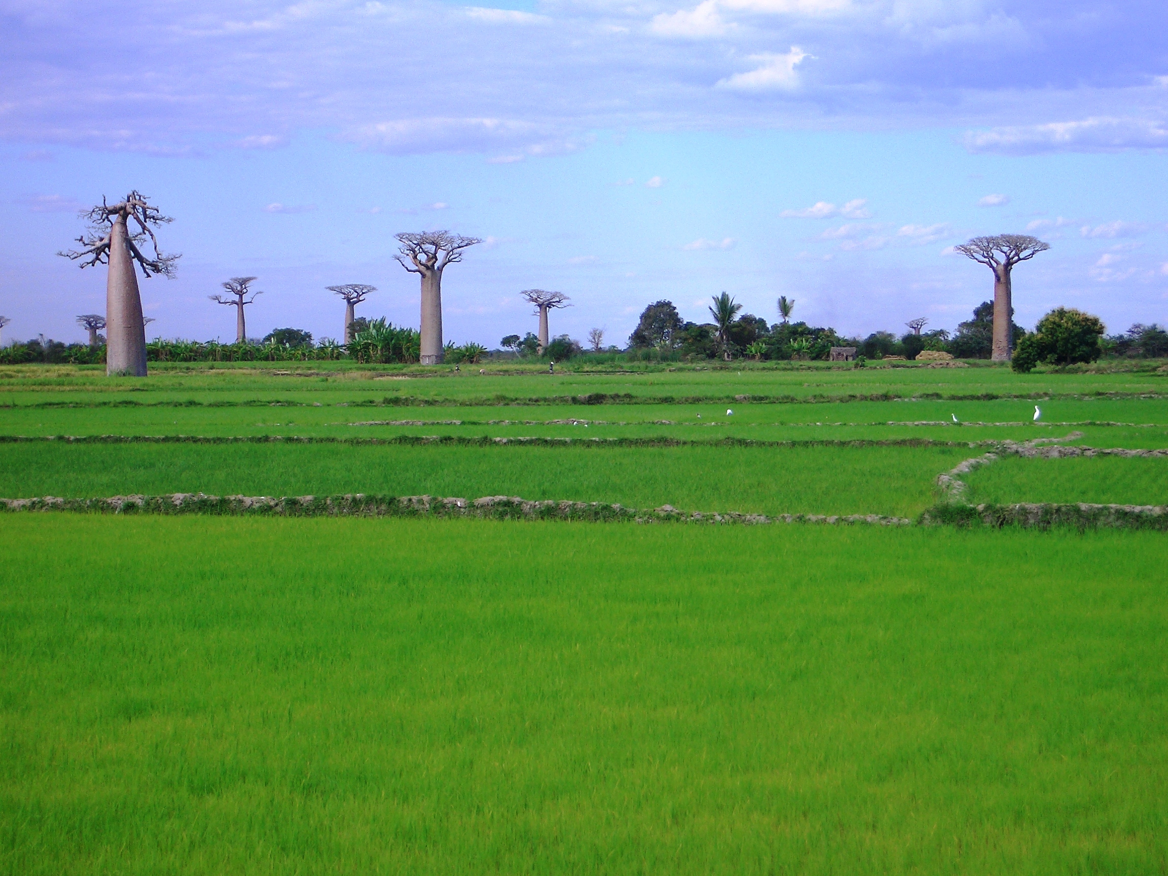 Affenbrotbäume/Baobabs (Adansonia grandidieri) und Reisfelder im Westen der Insel aufgenommen in der Nähe von Morondava.