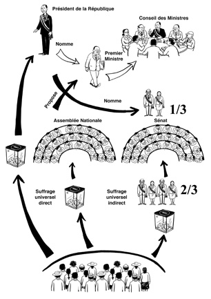 Madagaskar ist eine Präsidialrepublik nach französischem Vorbild. Der Präsident wird direkt vom Volk gewählt und ernennt den Ministerpräsidenten, der vom Parlament bestätigt werden muss. Das Parlament besteht aus zwei Kammern, der Nationalversammlung und dem Senat. Die Nationalversammlung hat 151 Mitglieder und wird direkt vom Volk gewählt. Der Senat hat 33 Mitglieder. 22 werden indirekt gewählt und repäsentieren die 22 Regionen. Die restlichen 11 werden vom Präsidenten ernannt.