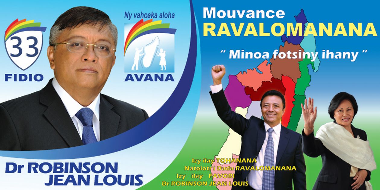 Der Arzt Dr. Jean-Louis Robinson von der Partei AVANA war Gesundheitsminister unter Marc Ravalomanana. Er wird vom Ehepaar Ravalomanana unterstützt und wirbt mit diesem auch in seiner Kampagne. Er hat angekündigt, Lalao Ravalomanana in sein Kabinett zu integrieren und eine Rückkehr von Marc Ravalomanana nach Madagaskar anzustreben. Inhaltlich setzt Robinson Schwerpunkte in der Gesundheitsversorgung, der Infrastruktur, der Frauenförderung und er will insbesondere mit dem Tourismus die lahmende Wirtschaft wieder ankurbeln.