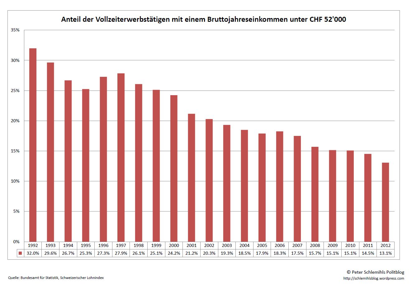 Schliesslich zeigen die Fakten auch, dass immer weniger Arbeitnehmende in der Schweiz bei einem Vollzeitpensum brutto weniger als 52’000 Franken pro Jahr (das entspricht bei 13 Monatslöhnen 4’000 Franken pro Monat) verdienen. Waren es 2001 noch über 21% und 2006 noch rund 18%, so waren es 2012 nur noch rund 13%.