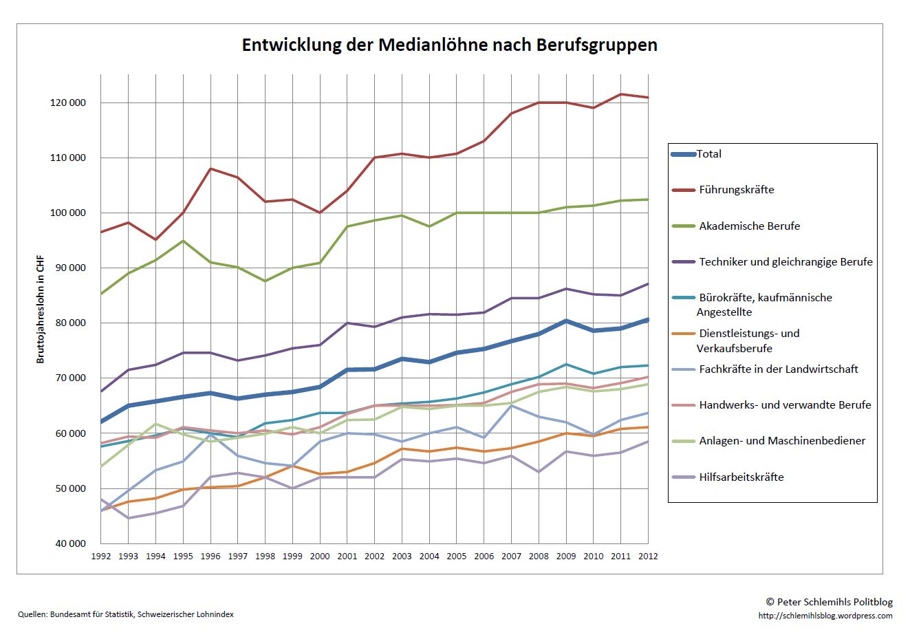 Kritiker könnten jetzt natürlich einwenden, es handle sich bei der von mir dargestellten Reallohnentwicklung um Durchschnittslöhne und es hätten nur wenige Reiche profitiert, währenddem die Mehrheit der Arbeitnehmenden leer ausgegangen sei. Diese Behauptung kann anhand der Entwicklung der Medianlöhne nach Berufsgruppen widerlegt werden. Beim Medianlohn handelt es sich um denjenigen Lohn, bei dem 50% der Arbeitnehmenden mehr und 50% weniger verdienen.