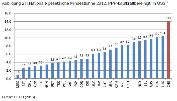 Zahlreiche OECD-Staaten kennen einen Mindestlohn oder es wird über eine Einführung diskutiert, wie in Deutschland und der Schweiz. Allerdings ist in keinem anderen OECD-Staat der Mindestlohn (auch kaufkraftbereinigt) auch nur annähernd so hoch, wie er in der Schweiz geplant ist. Das gilt selbst für die reiche Hochpreisinsel Luxembourg.