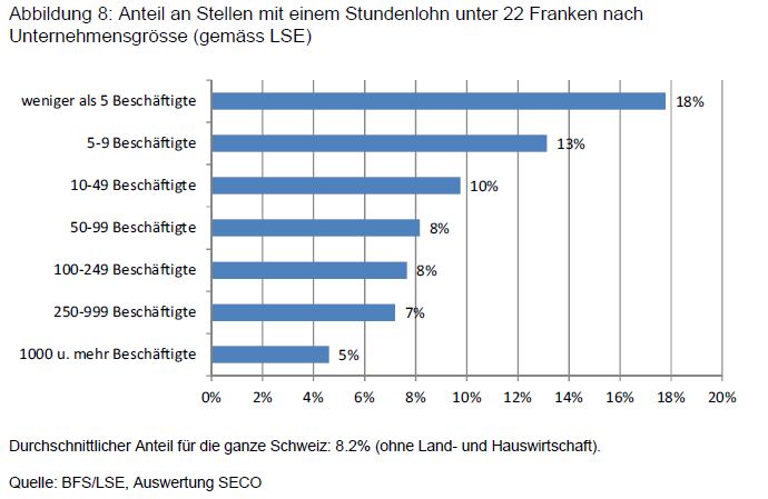 Von einem Mindestlohn betroffen wären in erster Linie Kleinstunternehmen. Bei Unternehmen mit weniger als 5 Mitarbeitenden beträgt der Anteil der Stellen mit weniger als 22 Franken Mindestlohn 18%. Bei solchen mit 5-9 Mitarbeitenden 13%.