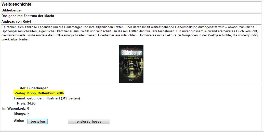 Daneben wird auch der Klassiker in der Bilderberger-Verschwörungsliteratur von Andreas von Rétyi angeboten und empfohlen: