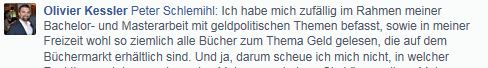 Auf die Frage, was ihn dazu qualifiziere solche Bewertungen vorzunehmen, antworte Kessler, er habe sich im Rahmen seiner Bachelor- und Masterarbeit mit „geldpolitischen Themen“ befasst und er lese zudem in seiner Freizeit allerhand Bücher zum „Thema Geld“.
